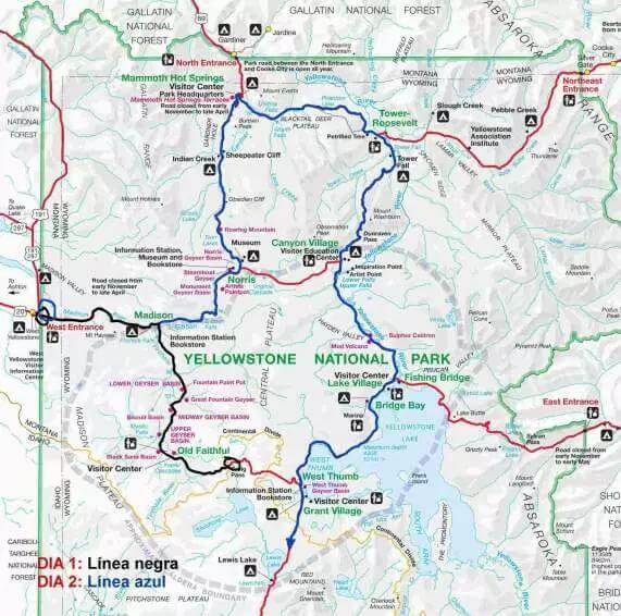 El recorrido en el parque se distribuye a través de una carretera de doble sentido en forma de 8, la Grand Loop Road. Aquí os dejo mi recorrido en los días que permanecí en el parque.